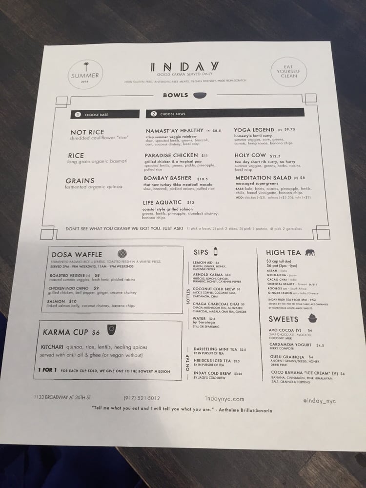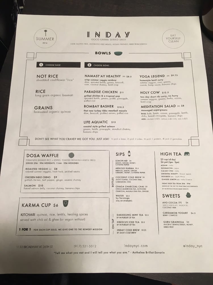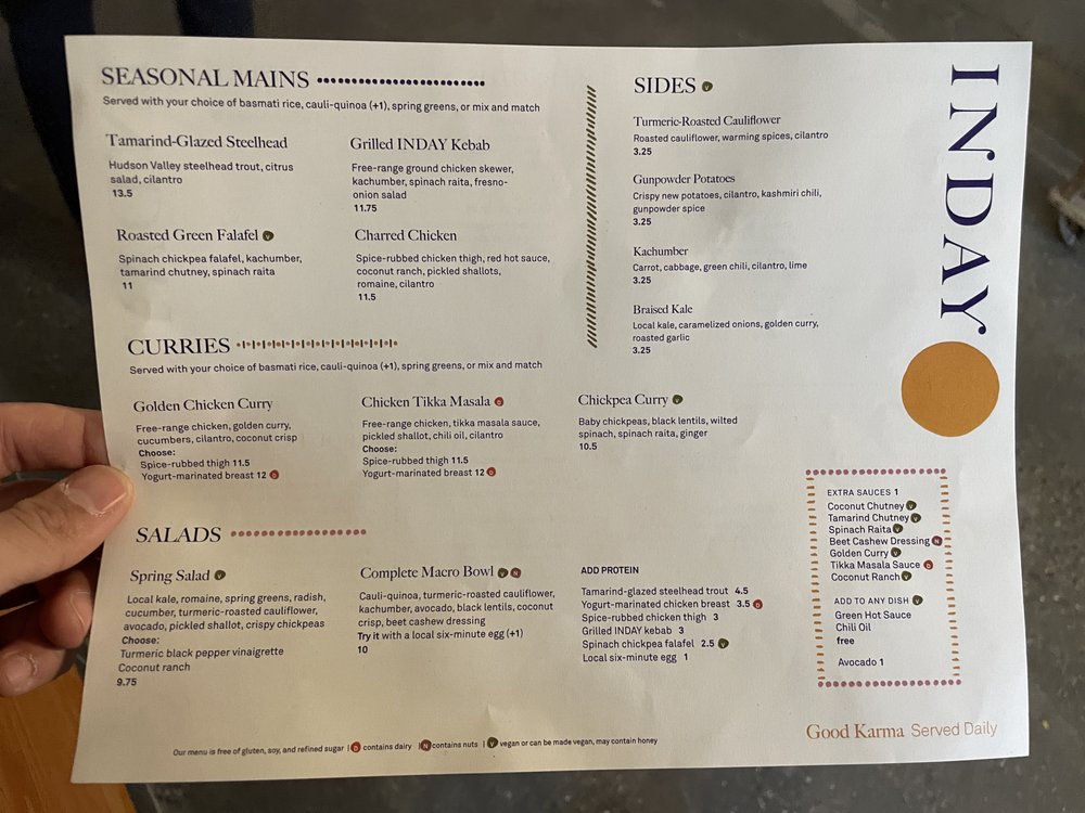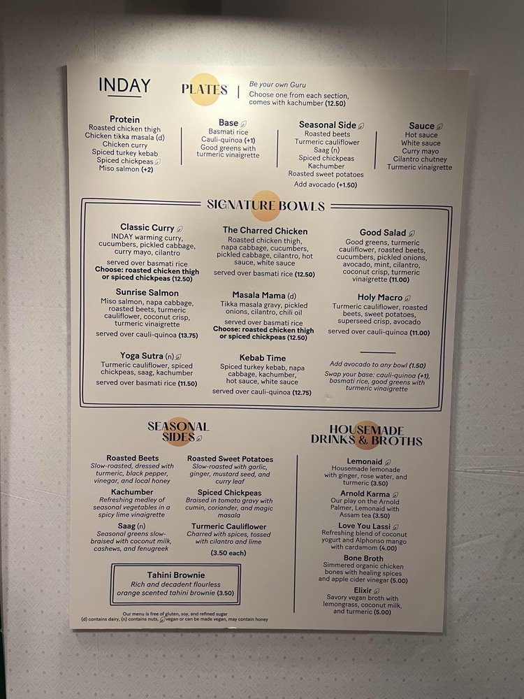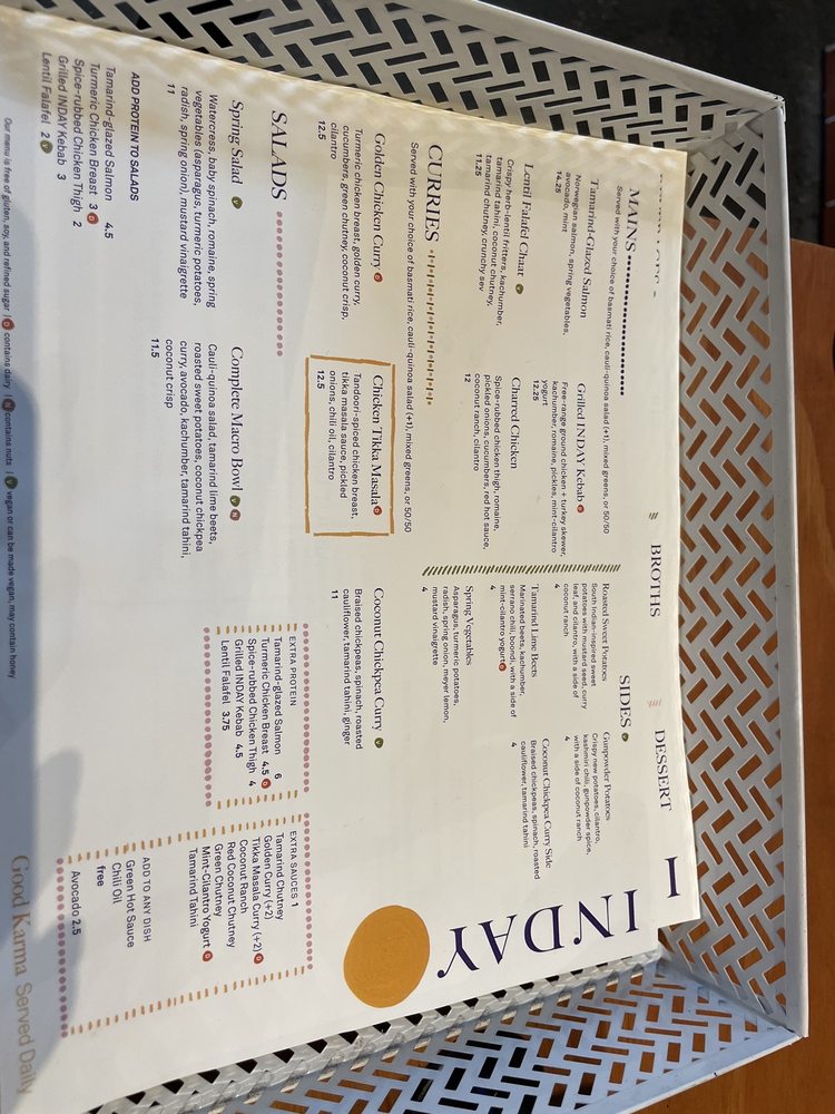 INDAY is a popular Indian gluten-free salad spot located in New York City. Known for its healthy and tasty dishes, INDAY offers a variety of options for both lunch and dinner, including build-your-own bowls and traditional Indian favorites like chicken tikka masala. Customers rave about the consistently delicious food, friendly staff, and quick service. The cozy and laid-back atmosphere makes it a perfect spot for a casual meal. Highlights include the golden chicken curry, garlic naan, and tamarind margarita. Whether you're looking for a quick bite or a leisurely lunch, INDAY is a must-visit for foodies looking for a unique and satisfying dining experience.